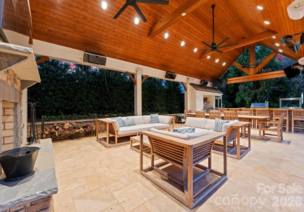 A true entertainer’s paradise, the outdoor sanctuary connects the two homes with seamless luxury. The centerpiece is the infinity-edge pool with waterfall feature, sun ledge, and integrated hot tub, surrounded by multiple covered patios, fireplaces, and lounging spaces. The pool house with full bathroom and grand pavilion host a fully equipped Danver outdoor kitchen with high-end grilling, smoking, Evo and Gaucho cooking stations, while overhead heaters and ceiling fans make it the year-round destination for gatherings of any scale.
