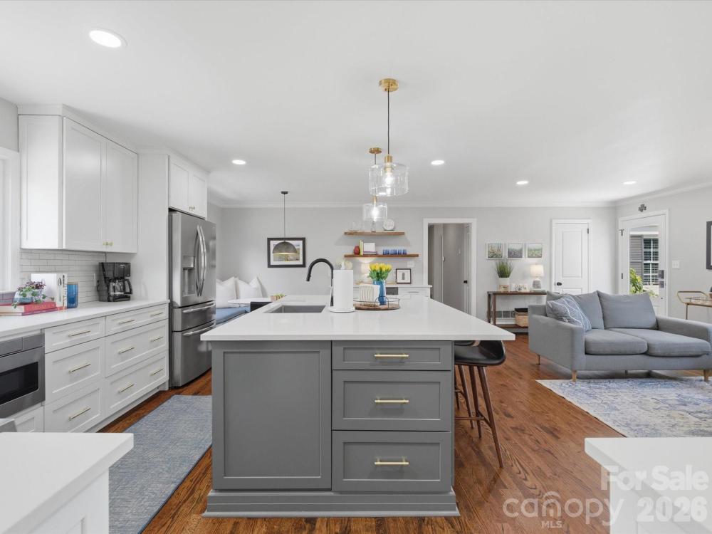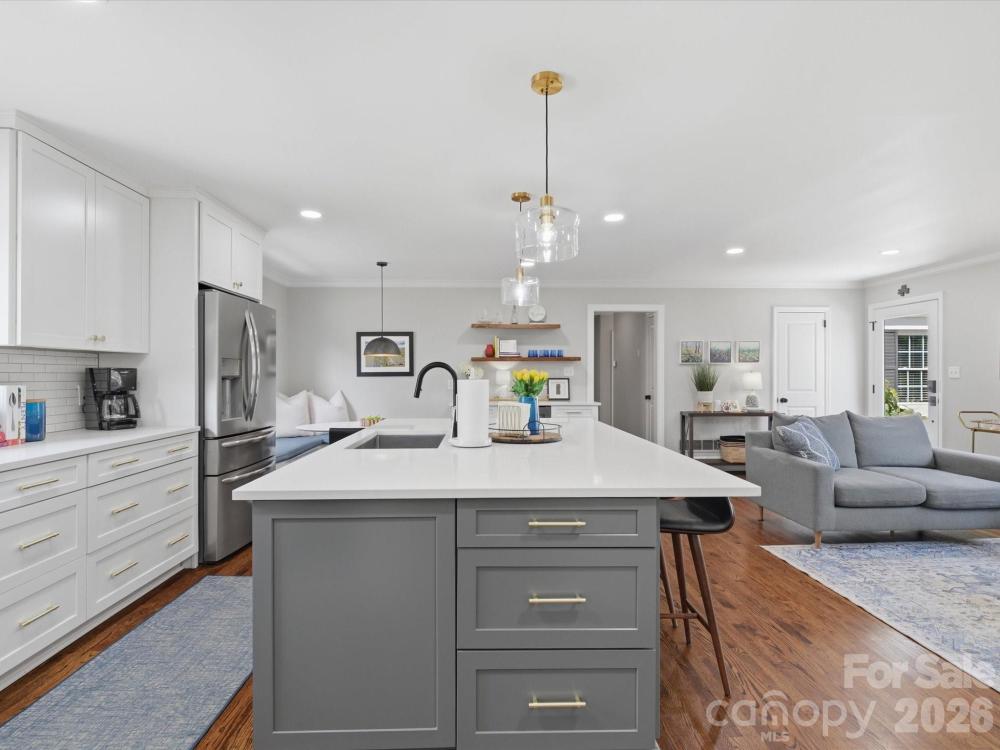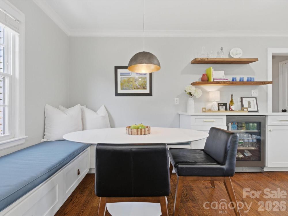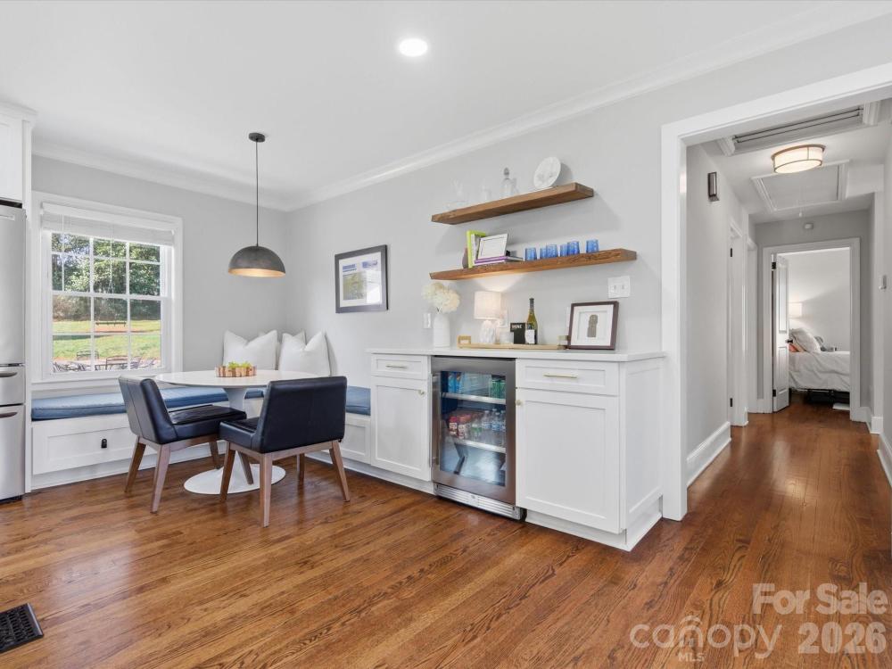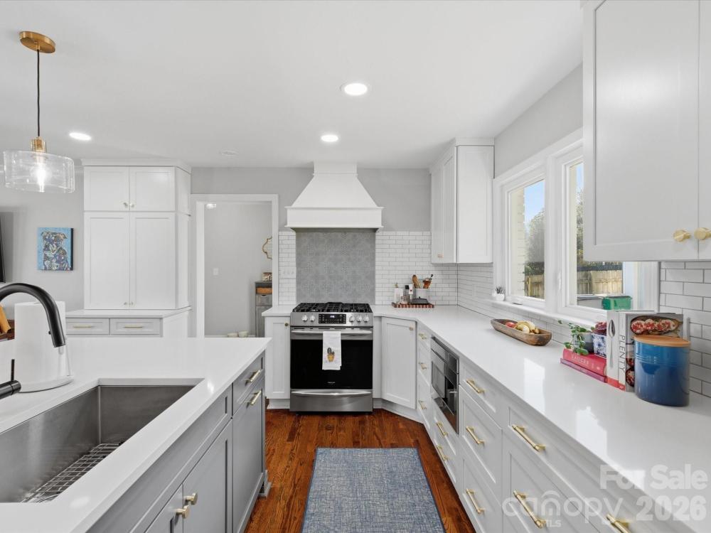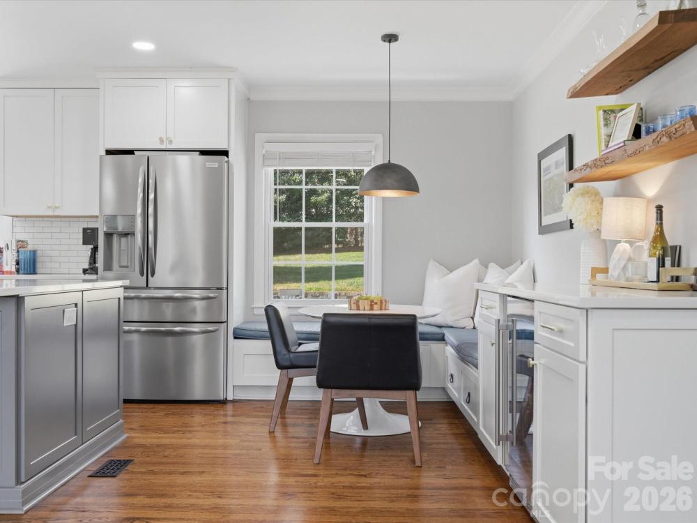 Waterbury Drive offers a thoughtfully updated four-bedroom, two full bath home on a private, wooded .31 acre lot with no HOA. The property has been well-maintained with regular tree care, blown-in insulation throughout, and mature landscaping that enhances privacy and natural light. The fully renovated kitchen includes newer appliances, a five-burner gas range, built in under counter microwave, a large single-bay sink with disposal, a new dishwasher, ample cabinet storage with pull-out drawers, a tiled backsplash, a modern exhaust hood, an oversized island with storage, and updated lighting with pendants over the bar and a new breakfast area fixture. A kitchen drink station with added cabinetry and a beverage cooler connects to built-in banquette seating in the breakfast area. Original hardwood floors have been refinished, complemented by new interior doors and hardware, recessed lighting in the kitchen and living areas, ceiling fans throughout, and pocket doors in both bathrooms. The primary suite features a large tiled shower and walk-in closet, while the hall bath has been completely renovated with new tile flooring, vanity, and a tiled shower-tub combination. Additional improvements include a renovated laundry room with a gas or electric dryer hookup, a tankless water heater, double insulated living room window installed in 2016, HVAC installed in 2012 with new ductwork, and interior and exterior paint completed in 2020. Outdoor highlights include a fenced yard, front patio, paver patio with fire pit, retaining wall, rope swing, and a detached heated and cooled garage with recessed lighting. Conveniently located near top-rated schools, shopping, and dining. Home inspection already done by the seller and available upon request.